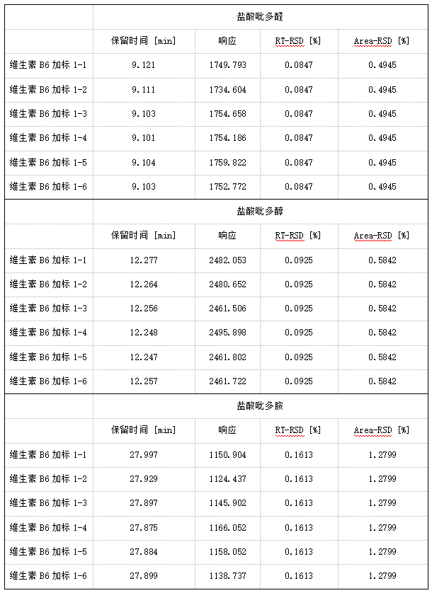 ·维生素B6各组分的保留时间和峰面积RSD均小于3%;